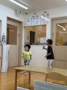 1人が紙飛行機を作って遊び始めると、もう1人も一緒に遊び始めました。