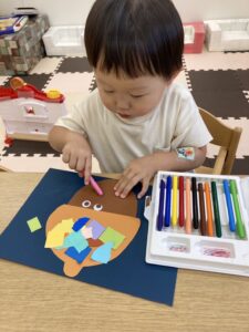 帽子にちぎった折り紙を貼り、お顔を描きました。