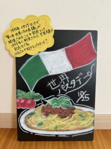 今月のウエルカムボードはひろば開催日25日、世界パスタデーをちなんだ絵です!