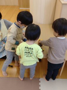 今日も男の子3人で楽しそうにクルマと電車遊びを楽しんでいます。