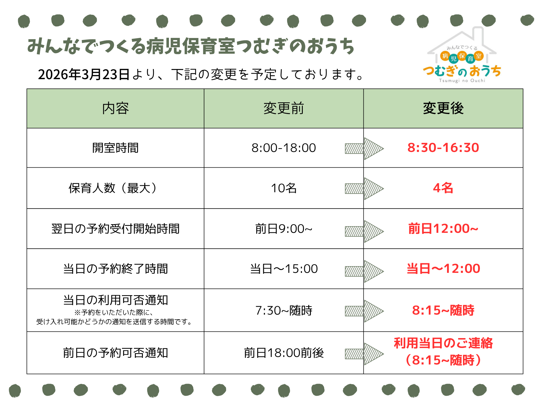 3/23(月)より、保育時間・利用人数・利用予約について変更点がございます。