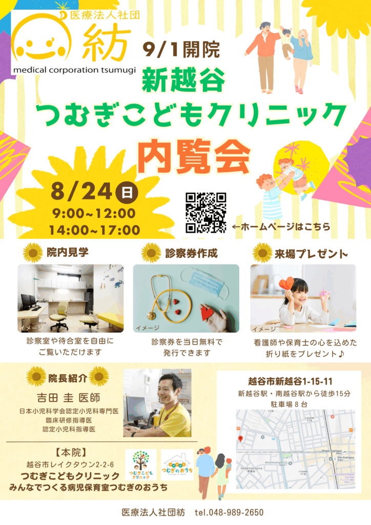 クリニックの開設申請が無事に許可され、「新越谷つむぎこどもクリニック」を正式名称としてお伝えできるようになりました。