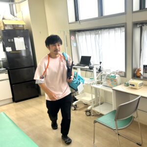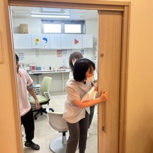 患者さんのいないお昼に実施しましたが、実際の災害時には患者さんを守るため、声を掛け合いながら避難誘導します。